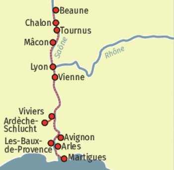 Auf der Rhône fahren Sie entlang der berühmten Weinlagen der Côtes du Rhône. Am Nachmittag unternehmen Sie einen Ausflug zu den spektakulären Schluchten der Ardèche. Von den Aussichtspunkten genießen Sie einen atemberaubenden Blick in die bis zu 300 m tiefen Schluchten.