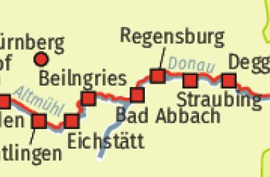 Entlang der Altmühl fahren Sie bis nach Dietfurt, wo Sie auf den Main-Donau-Kanal treffen. Ab Kelheim, mit seiner mächtigen Befreiungshalle, radeln Sie auf dem Donau-Radweg weiter nach Bad Abbach.