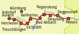 Zunächst erreichen Sie Donaustauf am Fuße der Wallhalla. Weiter geht es durch das Weinanbaugebiet Bach bis nach Straubing, der altbayerischen Herzogs- und Residenzstadt.