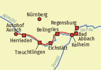 Auf ihrem Weg von der fränkischen Alb bis zur Donau durchzieht die Altmühl fantastische Landstriche. Im Naturpark Altmühltal prägen enge Täler mit bizarren Felspartien des Jura und die Wachholderheide das Landschaftsbild. Diese von ihrer Beschaffenheit einfache Tour führt Sie abseits des Verkehrs durch eine Flusslandschaft von sanfter Schönheit.