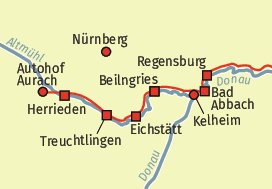 Durch den Luftkurort Pappenheim radeln Sie weiter, vorbei an bizarren Felspartien des Jura, in die Bischofs- und Universitätsstadt Eichstätt. Die Willibaldsburg sowie der Dom und der Residenzplatz laden zu einem Besuch ein.