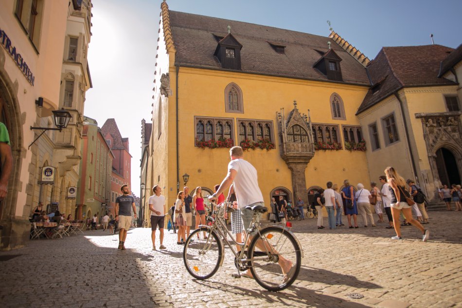 Nach dem Frühstück radeln Sie durch tiefgrüne Wald- und Wiesenlandschaften entlang des Donauufers nach Regensburg. Die mittelalterliche Altstadt ist eine der imposantesten in Deutschland und zeigt sich mit unzähligen verwinkelten Gassen und belebten Plätzen. Entdecken Sie einen Teil der 1200 historischen Bauten, wie z. B. die berühmte Steinerne Brücke und den Dom.