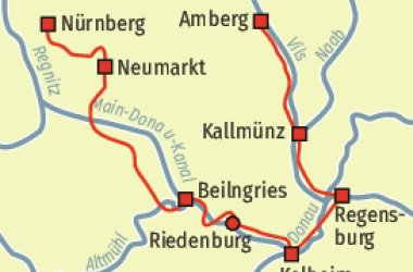 Sie verlassen die historische Stadt Amberg und radeln ab Haselmühl auf einer stillgelegten Bahnlinie. Entlang der Vils geht die Fahrt vorbei an Theuern mit seinem Schloss nach Schmidmühlen am Zusammenfluss von Lauterach und Vils, bis Sie schließlich den Markt Kallmünz erreichen.