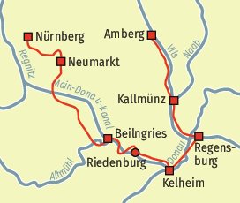 Unberührt wirkende Natur und historische Städte - es gibt viel zu entdecken auf Ihrem Weg entlang der Flussläufe. Sie durchfahren das Altmühltal und das Naabtal und lernen neben einer landschaftlich wunderschönen Region auch die Domstadt Regensburg sowie Nürnberg kennen.