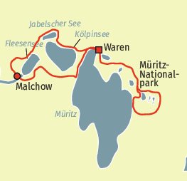 Entlang des Fleesensees erreichen Sie das Insel-Städtchen Malchow, dessen historischer Stadtkern sich auf einer Insel befindet. Am Jabelschen See vorbei, geht es zurück nach Waren.