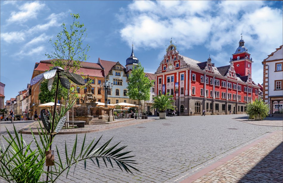 In Eisenach verlassen Sie den Herkules-Wartburg-Radweg und radeln weiter durch den Thüringer Wald. Der Weg führt Sie durch das von riesigen Obstplantagen geprägte Gothaer Land. Schon von Weitem erkennt man die markante Silhouette Gothas. Die vielen glanzvoll restaurierten Bürgerhäuser und das historische Rathaus von Gotha erinnern noch heute an die prunkvolle Vergangenheit der Stadt.