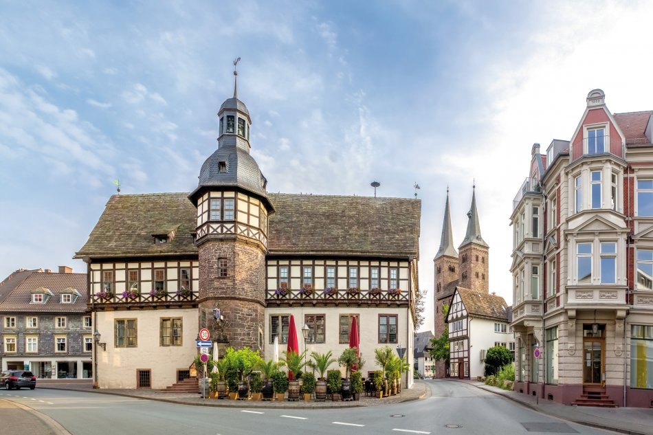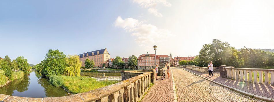 Dort, wo die Weser entsteht, in Hann. Münden, wechseln Sie von unserem Fahrradbus aufs Rad und radeln nach Bad Karlshafen. Die Stadt gilt als eine der Perlen des Weserberglandes und ist auch bekannt als„Stadt der Solequellen“.