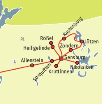 In Zondern besichtigen Sie das masurische Bauernmuseum. Anschließend reisen Sie weiter nach Lötzen zur Stadtbesichtigung. Dann führt die Strecke vorbei an mehreren Seen und dem ehemaligen Lehndorffschen Schloss in Steinort und über Rastenburg zurück nach Sensburg.