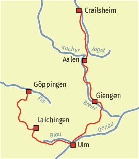 Entschleunigen Sie auf Ihrem Weg durch die abwechslungsreiche Landschaft. Charmante Städtchen und malerische Flusstäler wie Jagst, Kocher, Brenz, Donau, Blau und Fils liegen auf Ihrem Weg.