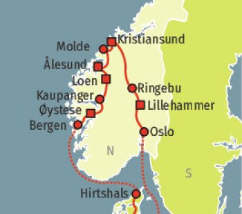 Heute unternehmen Sie eine Schiffahrt auf dem Geirangerfjord, einem der engsten Fjorde Norwegens mit prachtvollen Wasserfällen. Von Hellesylt fahren Sie dann mit dem Bus in die schöne Jugendstil-Stadt Ålesund und unternehmen eine 2-stündige Stadtbesichtigung.