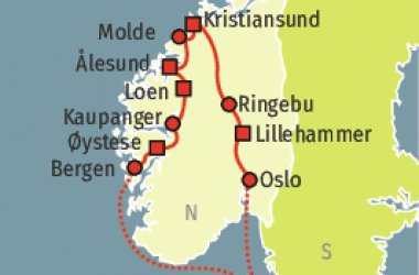 Heute reisen Sie landeinwärts und fahren durch das Dovregebirge und das beschauliche Gudbrandstal nach Ringebu. Hier besichtigen Sie die Stabkirche, eine der ältesten der 28 verbliebenen Stabkirchen Norwegens. Dann erreichen Sie die Olympia-Stadt Lillehammer.