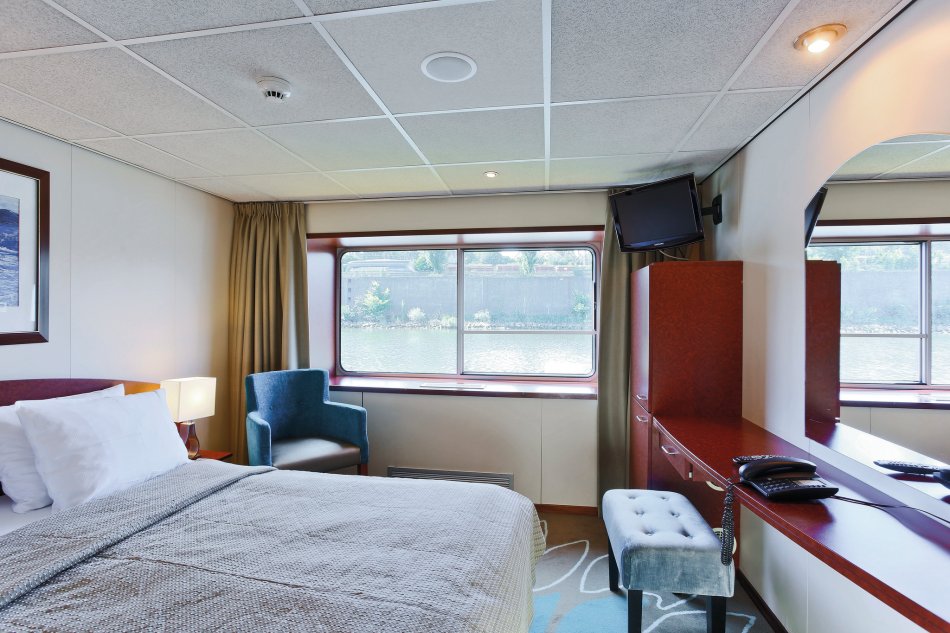 Mitteldeck: MANON: 2-Bett-Kabine, Panoramafenster, zu öffnen. / SERENADE 1: 2-Bett-Kabine, franz. Balkon, bodentiefe Fenster, zu öffnen.