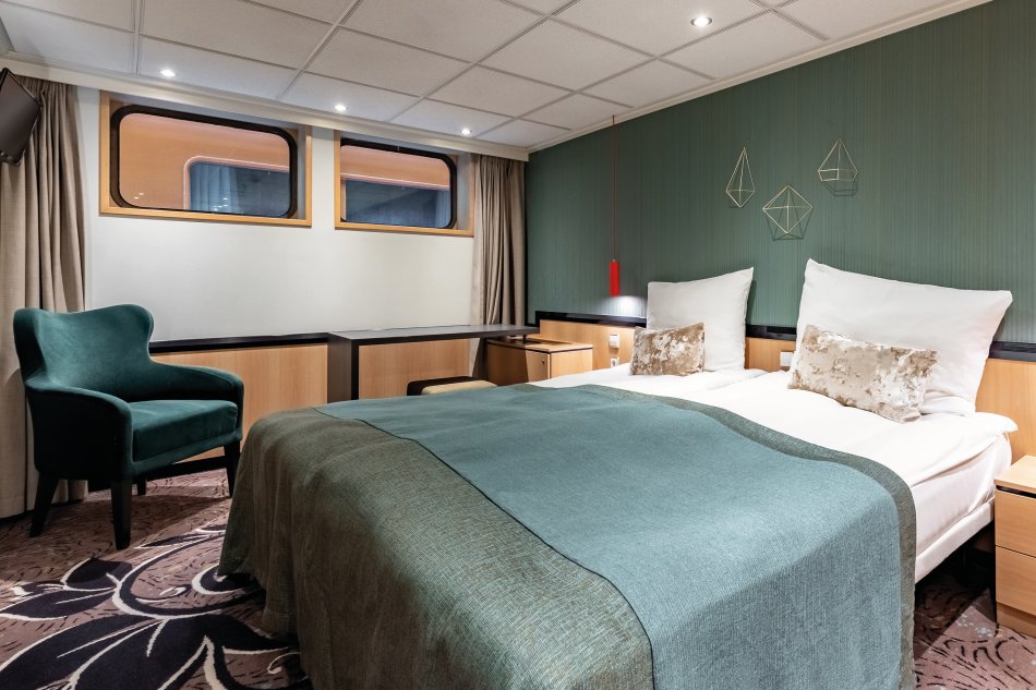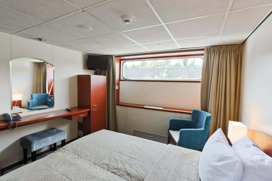 Oberdeck: 2-Bett-Kabine, franz. Balkon, bodentiefe Fenster, zu öffnen.
