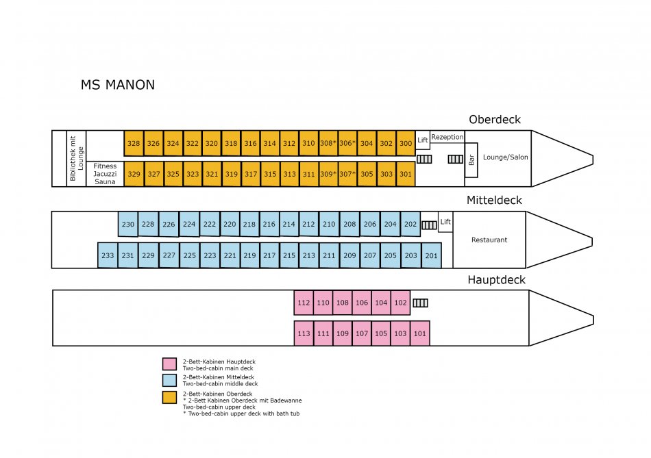 | EDV-Nr. DMKF | 2-Bett-Kab. Hauptdeck | 2-Bett-Kab. Mitteldeck | 2-Bett-Kab. Oberdeck |