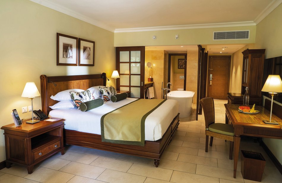 Sie wohnen im 5-Sterne-Hotel Maritim Resort & Spa Mauritius. Das Hotel liegt direkt am Strand der schönen Bucht Turtle Bay, umgeben von einer 25 ha großen Park- und Gartenanlage mit Wasserkaskaden. Sie wohnen in Deluxe Zimmern zur Meerseite (40 - 44 m²), komfortabel ausgestattet mit Badewanne und separater Dusche, WC, Föhn, Kosmetikspiegel, Sat-TV, gratis WLAN, Telefon, Safe, Kaffee-/Tee-Set, Minibar, Klimaanlage und Balkon oder Terrasse. Alleinreisende erhalten ein Doppelzimmer zur Alleinnutzung.