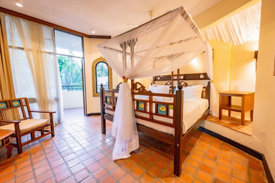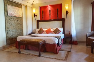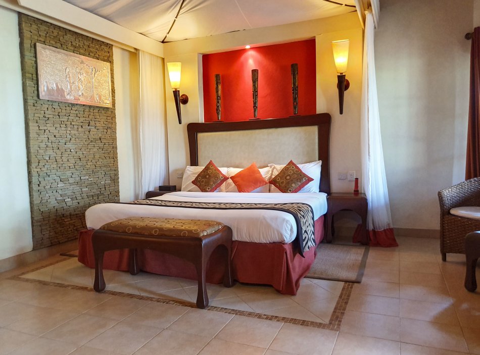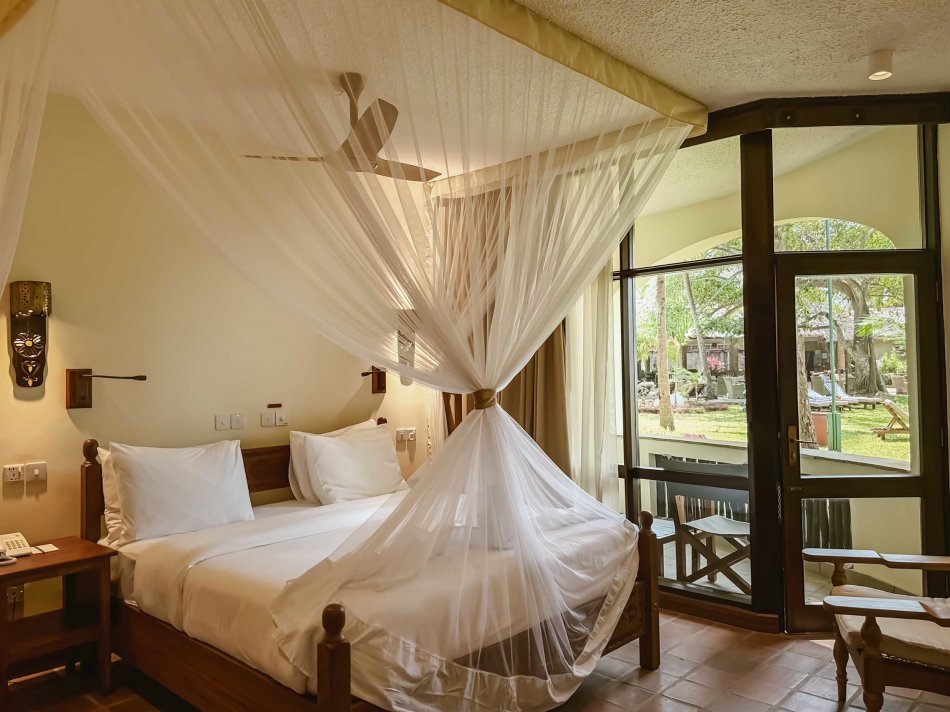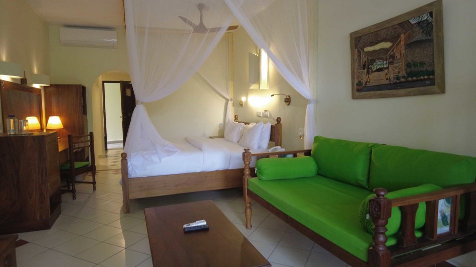 Am Indischen Ozean wohnen Sie im 4-Sterne-superior Hotel Severin Sea Lodge, einem nachhaltig geführten Resort unter deutscher Leitung. Das Hotel liegt direkt am Strand Bamburi Beach und ist umgeben von einem Palmengarten. Wir haben 30 m² große Standardzimmer für Sie gebucht, mit Dusche, WC, Föhn, Kosmetikspiegel, Doppelbett mit Moskitonetz, Sat-TV, gratis WLAN,Telefon, Safe, Kaffee-/Tee-Set, Minibar, Deckenventilator, Klimaanlage und Balkon oer Terrasse mit Gartenblick. Gegen Aufpreis können Sie Deluxe Bungalowzimmer buchen, die näher zum Strand liegen.